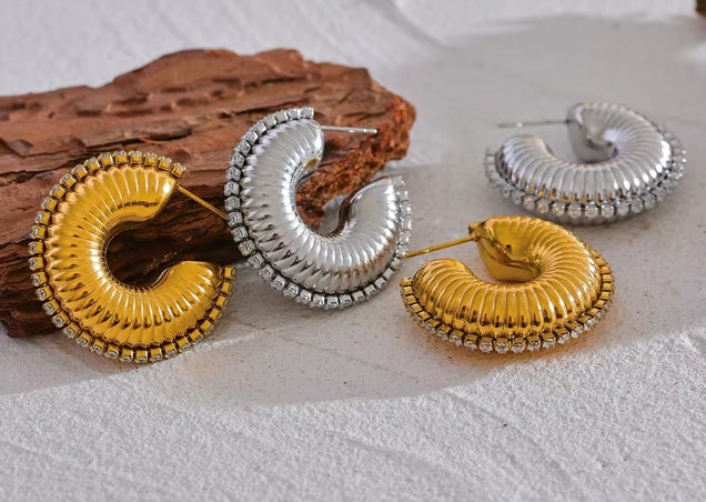 Answer 1: The earrings are made from premium stainless steel with a PVD 18K gold plating, ensuring durability and a luxurious finish.
