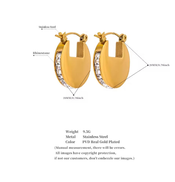 Answer 1: The earrings are made from premium stainless steel with a PVD 18K gold plating, ensuring durability and a luxurious finish.