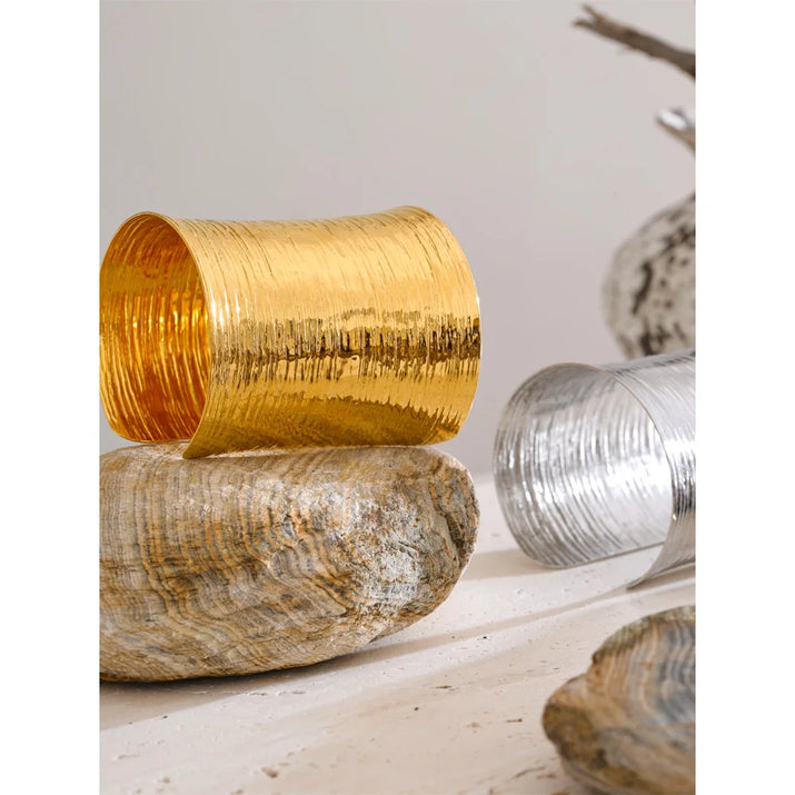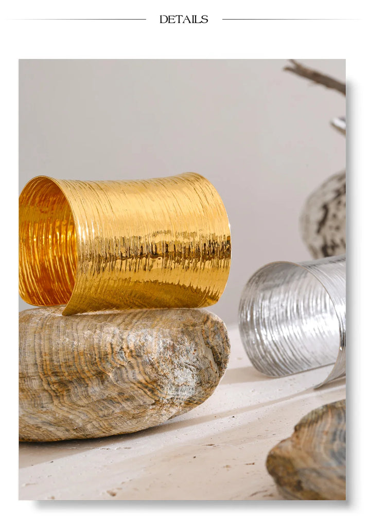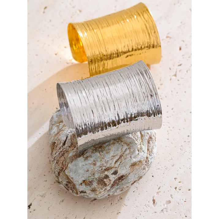 Make a bold fashion statement with this wide stainless steel bracelet, featuring a striking metal texture and luxurious PVD gold plating for a timeless look that enhances any outfit.